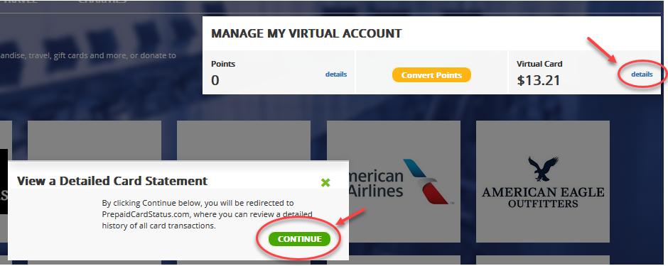 You can check your balance, card details, spend history and more online at any time. Log into www.prepaidcardstatus.com. Your Rewards program site will also display this information as follows: